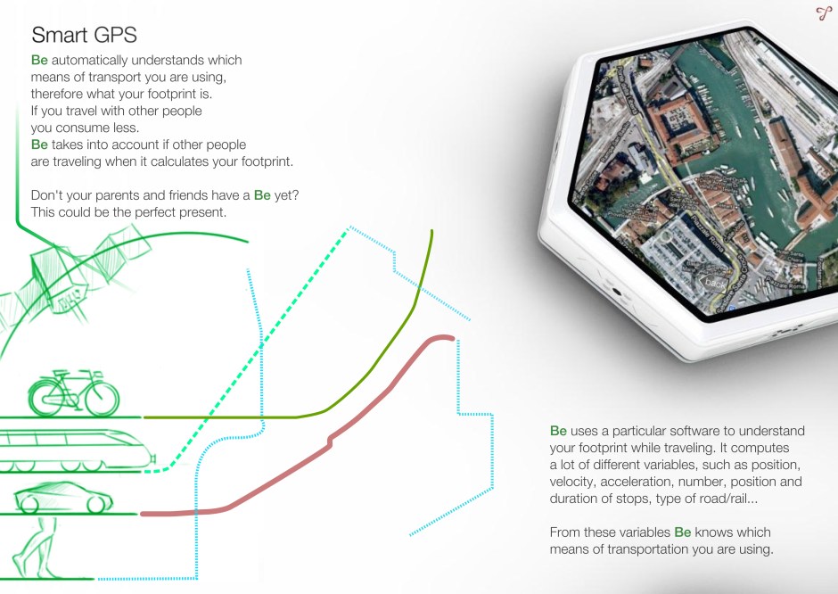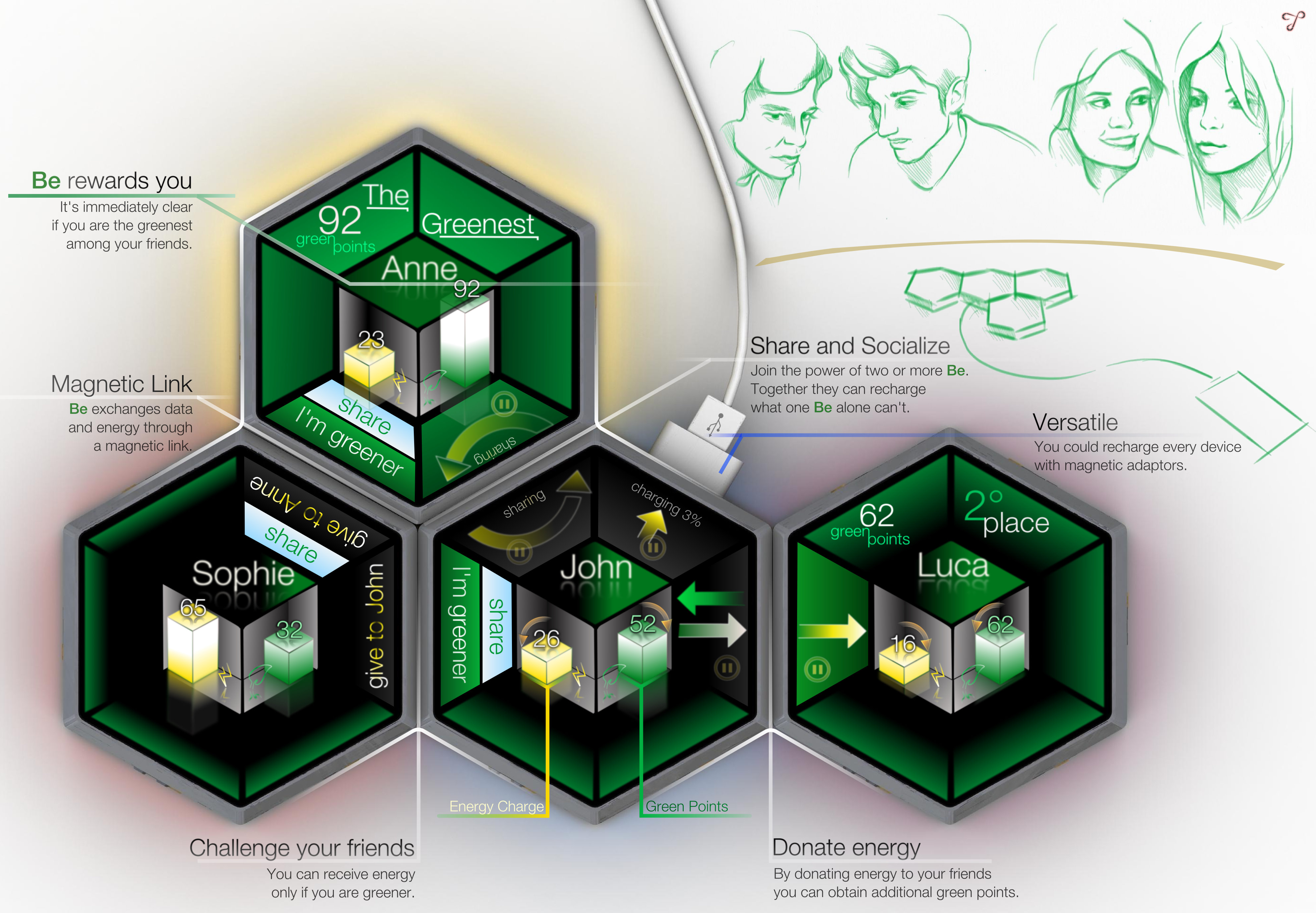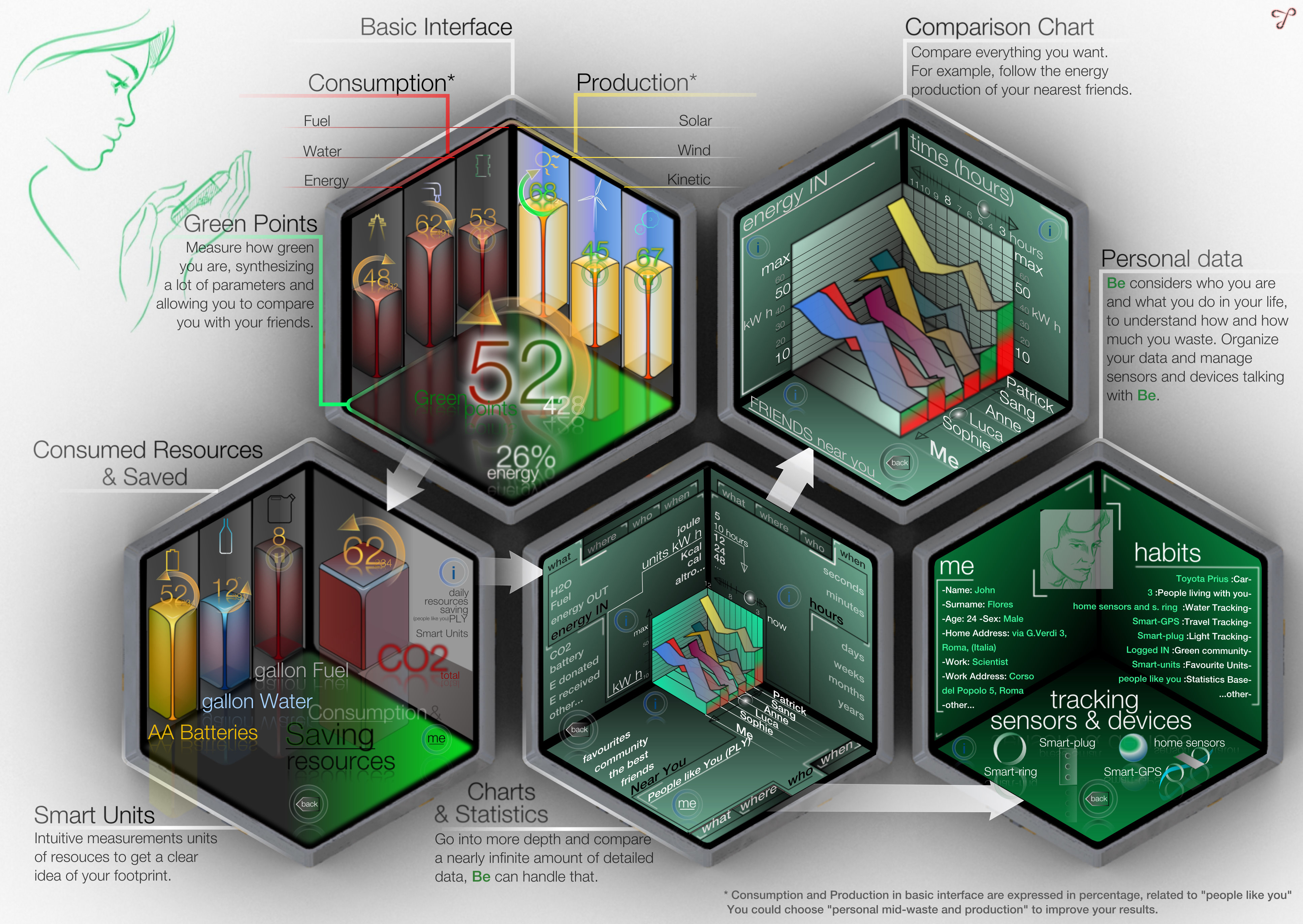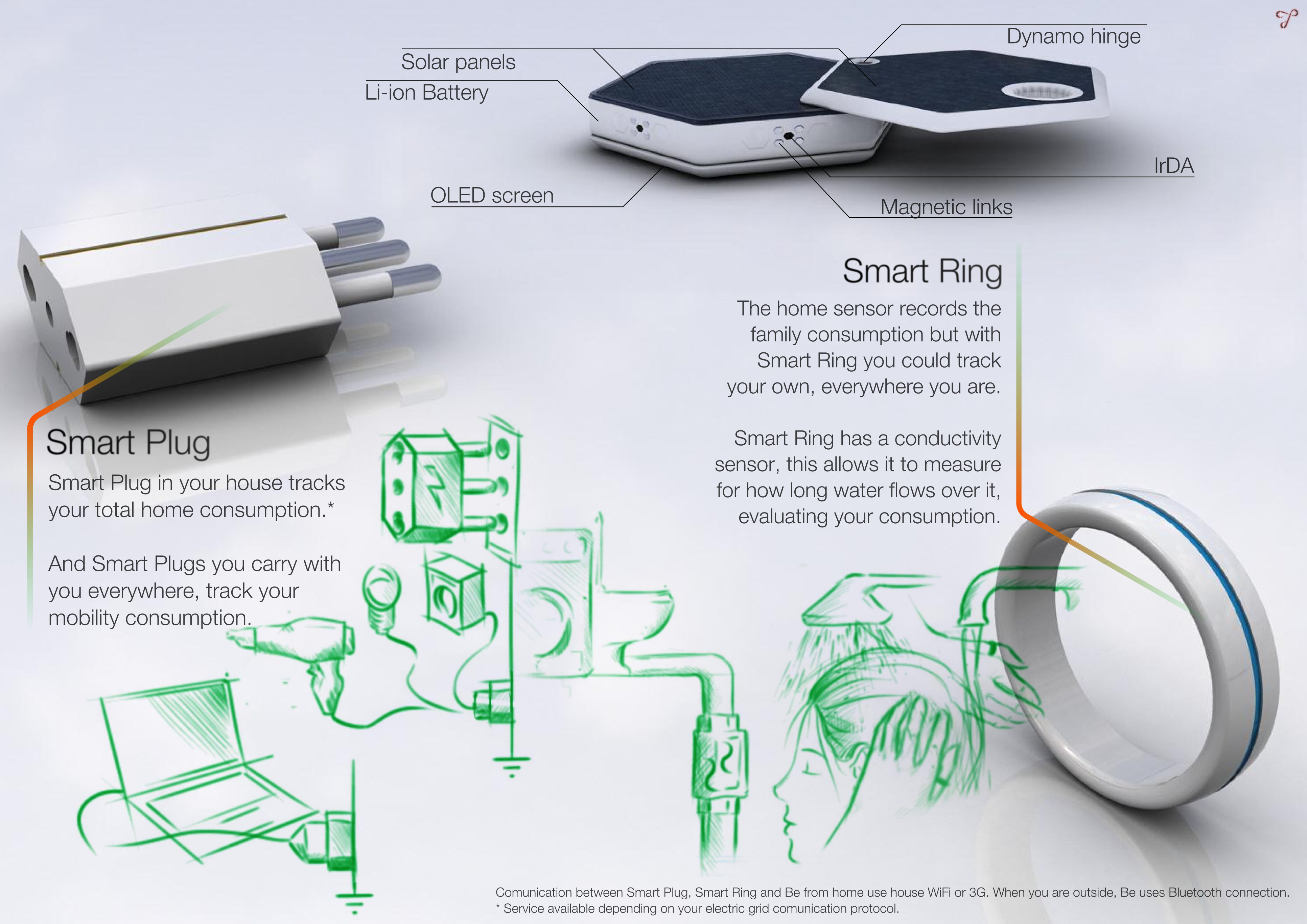 Le prese Smart in casa comunicano tra loro tramite protocollo interno della rete elettrica. Questo fornisce dati in tempo reale sul consumo domestico. Una delle prese si connette tramite rete telefonica fissa e manda i dati via GSM a Be. Il consumo è minimo: sono pochissimi dati numerici. Le prese che si connettono ai dispositivi in mobilità comunicano invece con Be via Bluetooth. I sensori per il consumo di acqua si inseriscono nella tubatura principale accanto al contatore standard. I dati vengono comunicati via presa Smart casalinga che ritrasmette i dati a Be. Lo Smart ring è un anello molto essenziale, che ospita un sensore di conducibilità elettrica. Se passa acqua sull'anello (e quindi ci stiamo lavando) il sensore, stabilendo un contatto elettrico, se ne accorge, e, appena è sufficientemente vicino a Be (quando lo prendi in mano dopo la doccia ad esempio) manda un impulso infrarosso che comunica per quanti secondi di tempo l'acqua è scorsa su di esso. Il consumo di energia è irrisorio per l'anello che si ricarica tramite il movimento della mano. La conducibilità è molto diversa per l'acqua salata, quindi il sensore non scatta con l'acqua di mare.